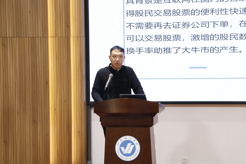 10月11日,公海gh555000aa线路检测在综合楼六楼报告厅举办“学术讲堂”第二期《投资的逻辑》专题讲座。本次讲座邀请到中金财富证券山东管理总部的产品顾问吴愫恒主讲,公海gh555000aa线路检测团总支负责人曹春蕾主持。