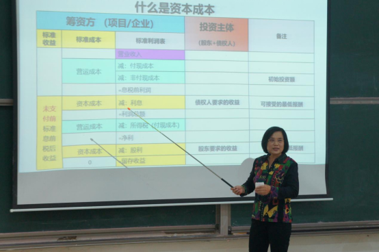 观摩课上,吴丽梅教授主要为同学们讲述了“资本成本”的相关内容。课堂之初,吴老师首先从相关概念及定义释义入手,在讲解过程中巧妙地融入了通俗易懂的案例,分别讲述了资本成本、个别资本、综合资本和边际资本等相关知识,让同学们更好地理解知识及所学内容。随后,吴老师带领同学们温故会计学中“标准成本、标准收益”等相关知识点,借助PPT、板书等工具,以筹资方与投资主体这两大主体为例,与企业案例相结合,引出财务管理学中“息税前利润”的概念,并深入分析了在筹建期、营业期、利润期等时期的成本情况,通过辩证思维讲述了投资的获利与风险。观摩课最后,吴老师将课堂所讲的“投资标准是否成功”作为思考题留给同学们,以了解员工对本堂课知识点的掌握情况,加深员工对本节知识点的理解与运用。本次财务管理观摩课在教师与同学们的交流互动中圆满结束。