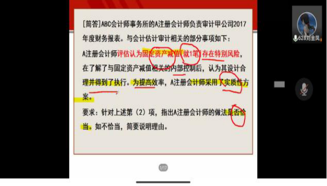 杨黎明老师就“审计风险=重大错报风险×检查风险”模型进行回顾。随后,逐步引导同学们对“控制测试”内容进行理解,从实际情况例举到理论知识运用,同学们积极与杨老师互动,主动在评论区答题、连麦讨论。在讲述“内部控制”时,杨老师既用自制表格带领同学们熟悉具体内容,又与员工连麦讲解各个简答题,集思广益,同学们敢于尝试、敢于争先,力争在实务工作中灵活运用。