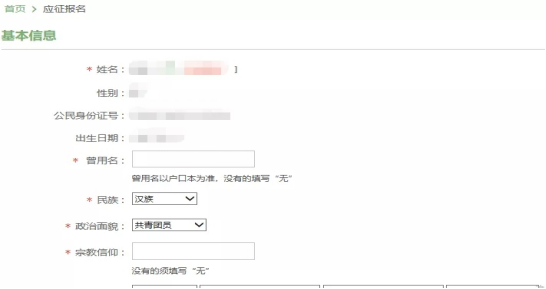 正式进入应征报名个人信息填写,需要录入基本信息、学业信息、家庭信息、参军信息等共4类28项信息。