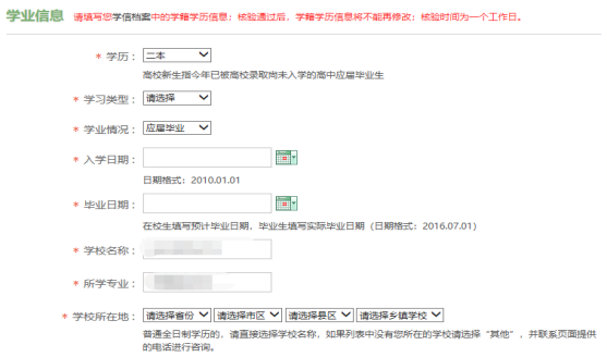 (2)学业信息。填写学信网员工档案中的学籍学历信息,如果对学籍信息有疑问,请登录学信网查看确认如果学业信息审核不通过,请咨询公司或武装部修改。核验通过后将不能更改,核验时间为一个工作日。
