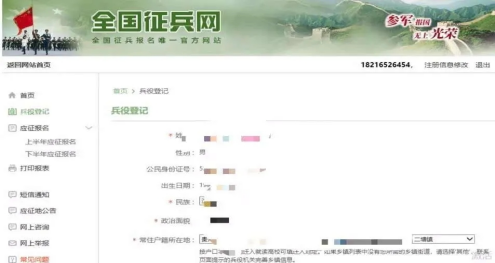 登录成功后进行兵役登记,填写相关个人信息,完成登记“点击继续进行本年度参军报名”。