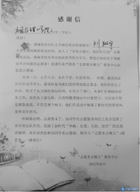 为提高公司学子的综合素质,进一步使员工感受社会生活,公司积极引导员工参加寒假社会实践。其中,公司会2101-2班刘翔宇同学,利用寒假时间,积极投身于“青春志愿行,我们在行动”志愿服务活动,受到“志愿者去哪儿”服务中心的高度认可。