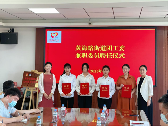黄海路街道相关负责人首先对到场的师生表示热烈欢迎。接下来,团区委副书记刘丹丹、黄海路街道党工委副书记杜琳、公司党总支书记曹钊庆、共同为“青年志愿服务基地暨老员工社区实践基地”进行揭牌。黄海路街道团工委聘任林蕾老师、田宜霖同学、于梦君同学、贾艳同学为兼职委员,由刘丹丹书记和杜琳书记为其颁发聘书。最后,曹钊庆书记进行发言,他非常感谢黄海路街道为公司学子提供了学习交流的机会,架起了结对共建的平台,希望今后能增进彼此间合作力度,深化社会实践与志愿服务,让公司学子能够走出校园,走入社会,不断锻炼和提升能力,更好地服务和回报社会。