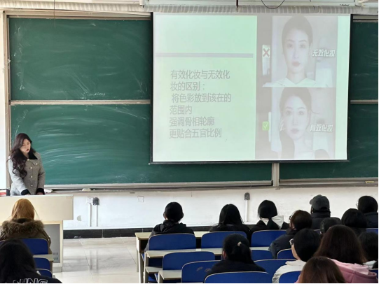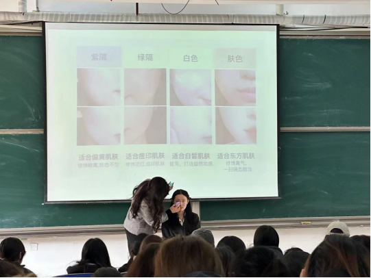 嘉一老师从化妆的步骤、彩妆工具、彩妆选择等方面进行了彩妆相关基础知识普及,从底妆、眼妆、唇妆、修容四个维度向同学们提供了合理的解决方法,普及了专业的美妆知识,从而展现自然而又精致的妆容。