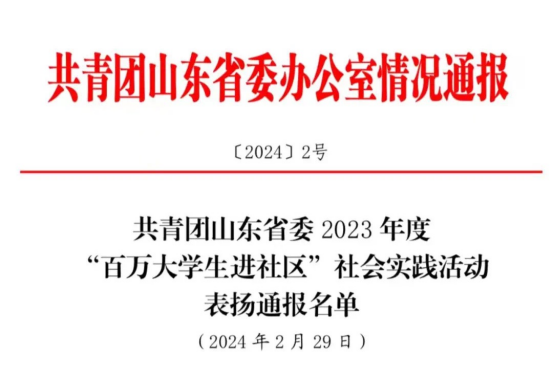 为激励先进、树立典型,进一步激发全省校地团组织和广大青年员工的参与热情,共青团山东省委公布2023年度《“百万老员工进社区”社会实践活动表扬通报名单》,公海gh555000aa线路检测会2251-3团支部荣获“先进集体”荣誉称号。