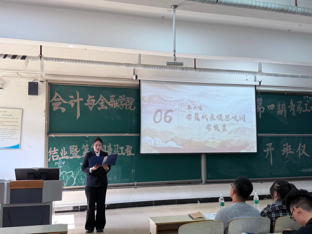 老生代表王正阳同学在发言中谈到第四期青马班的课程内容丰富,涵盖理论、实践、精神等多个方面,为学员搭建了一个全方位成长与进步的平台。他表示以“志”为先导,以“思”为中心,以“行”为方法,以“悟”为升华,做一名政治坚定、素质全面、模范担当、勇于创新的学员,今后将以更加饱满的热情与坚定的信念,投身于学习和实践中,为实现中华民族伟大复兴的中国梦贡献自己的青春力量!