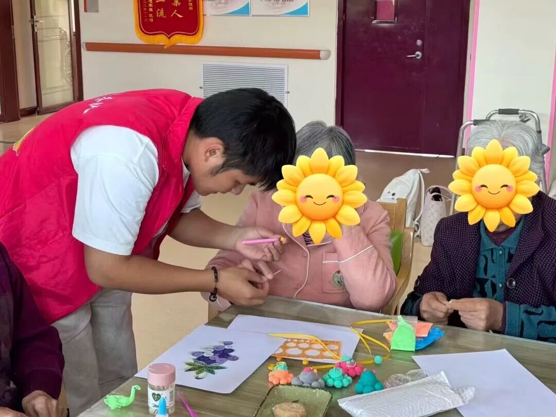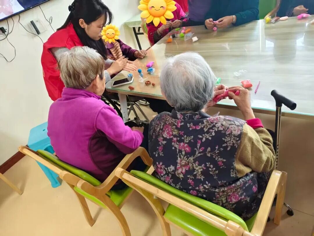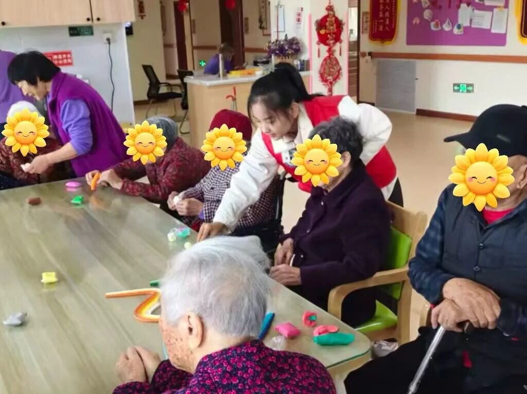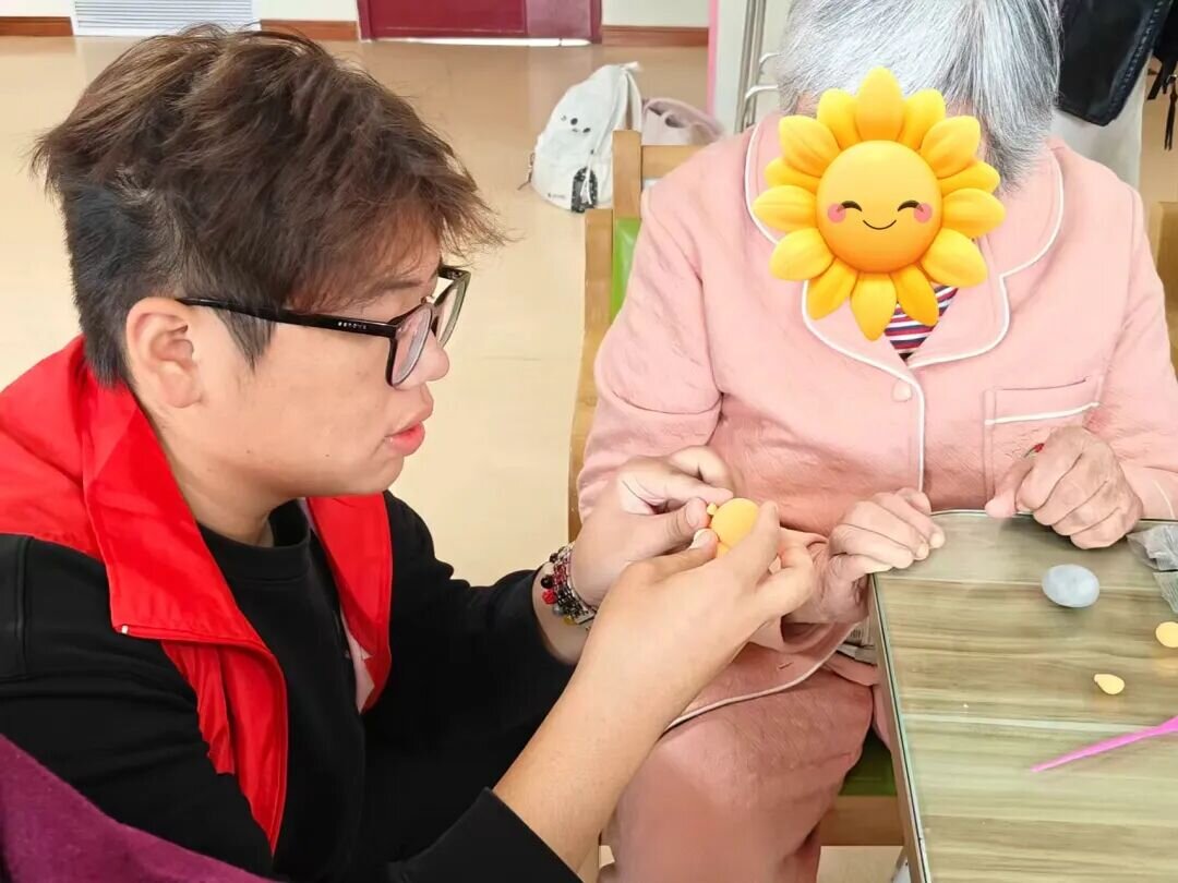 活动室内,志愿者们辅助老人捏塑橡皮泥,眼神专注而温和,仔细讲解着造型的技巧。在志愿者的引导下,老人们将彩色泥团塑造成一个个充满童趣的形状,整个空间弥漫着陪伴的温情与手工创作的欢乐氛围。